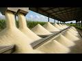 Descripción del proceso industrial que ocurre dentro de las fábricas gigantes de azúcar, donde enormes maquinarias convierten toneladas de caña en azúcar refinada lista para su distribución. Se muestra las distintas etapas de elaboración, desde la cosecha y el transporte de la caña, hasta la molienda, clarificación, evaporación, cristalización y secado final.